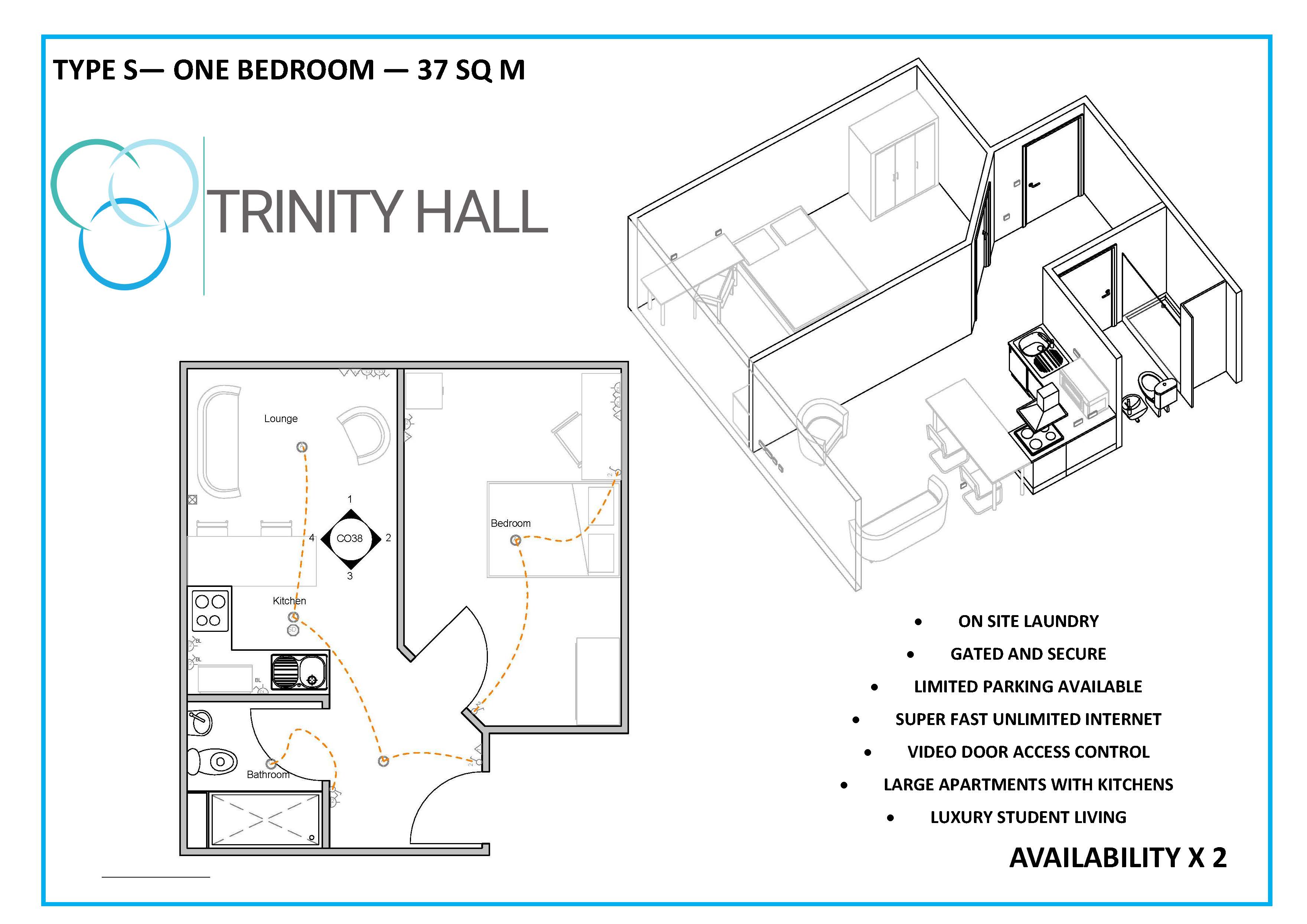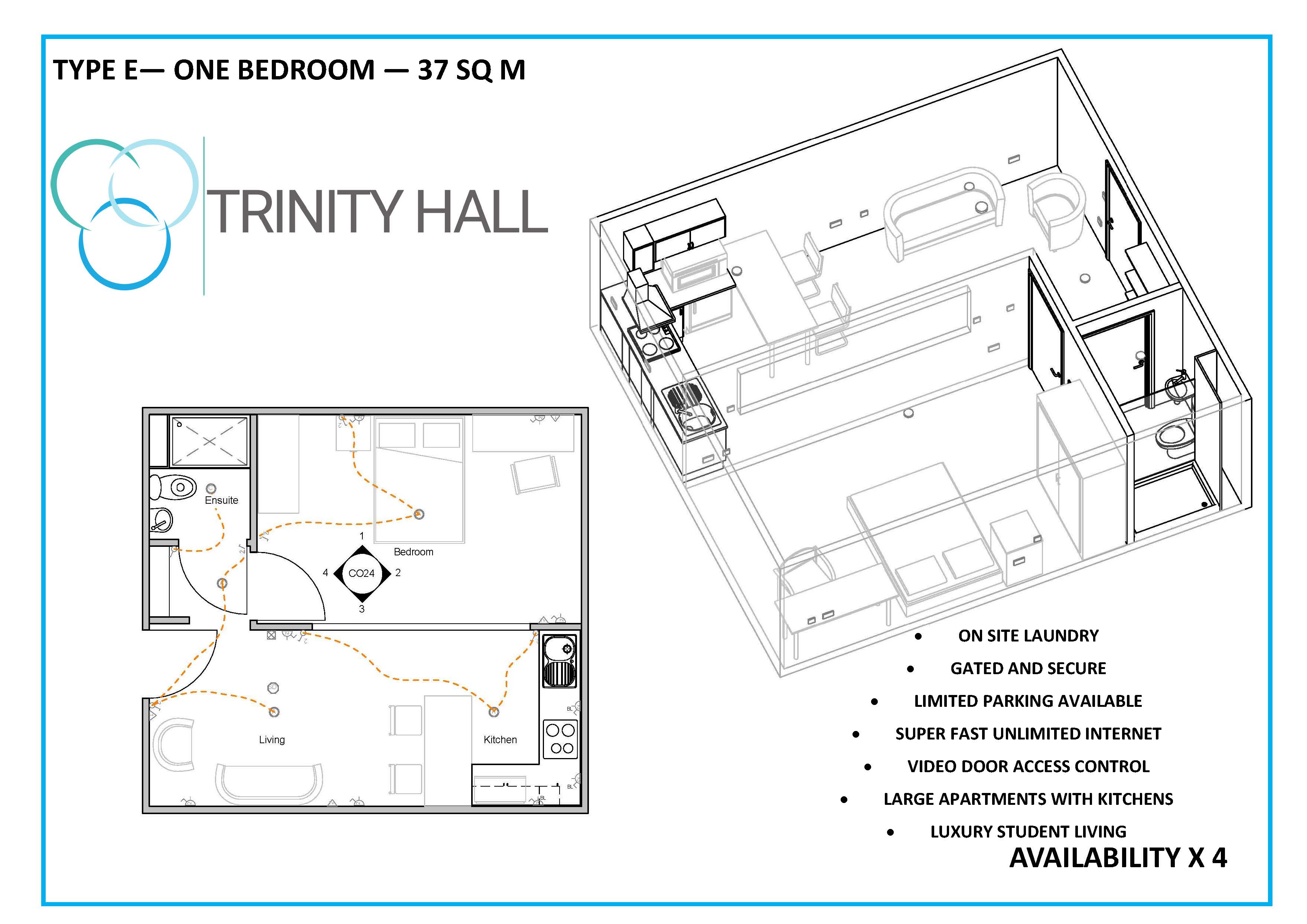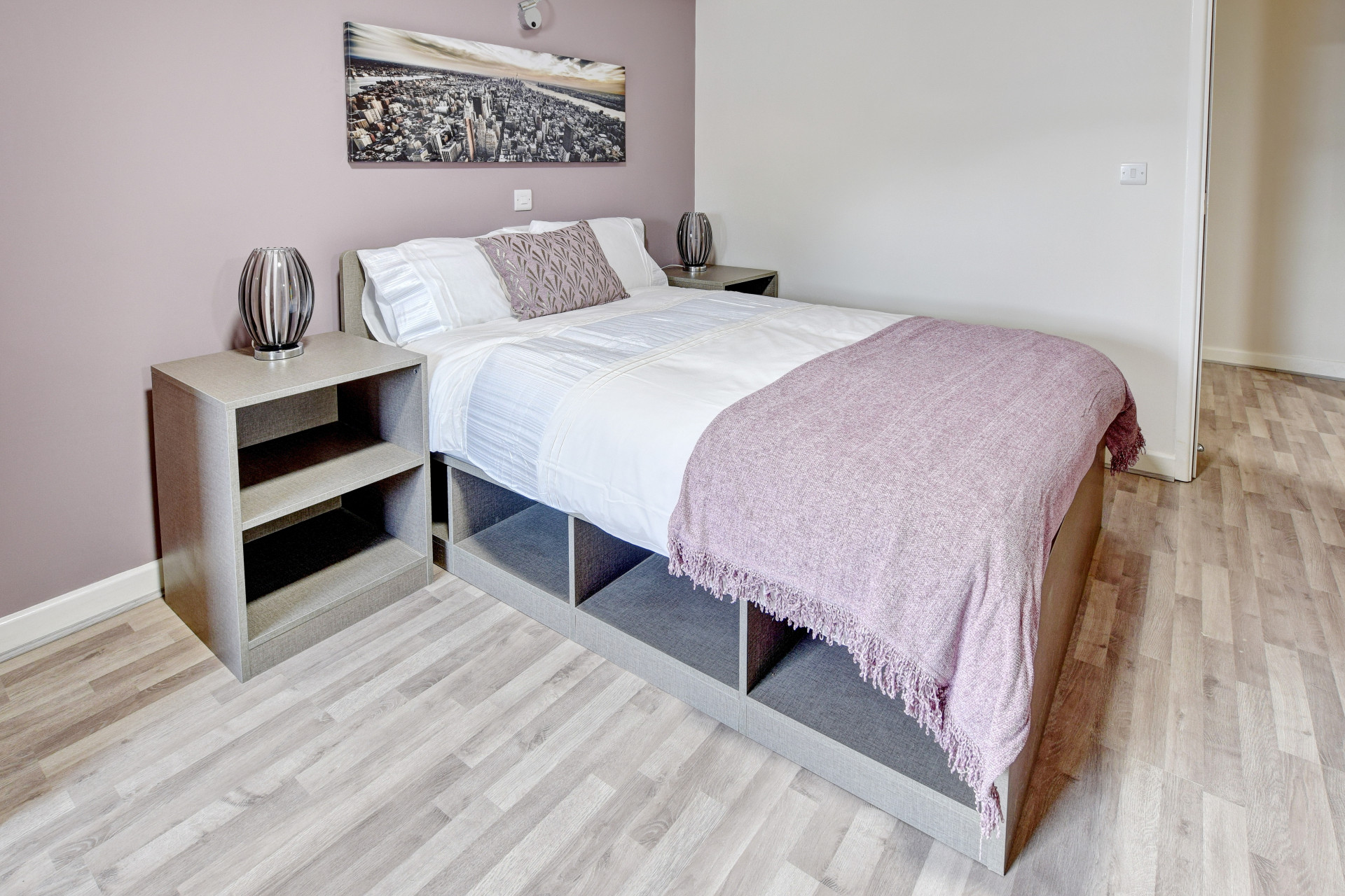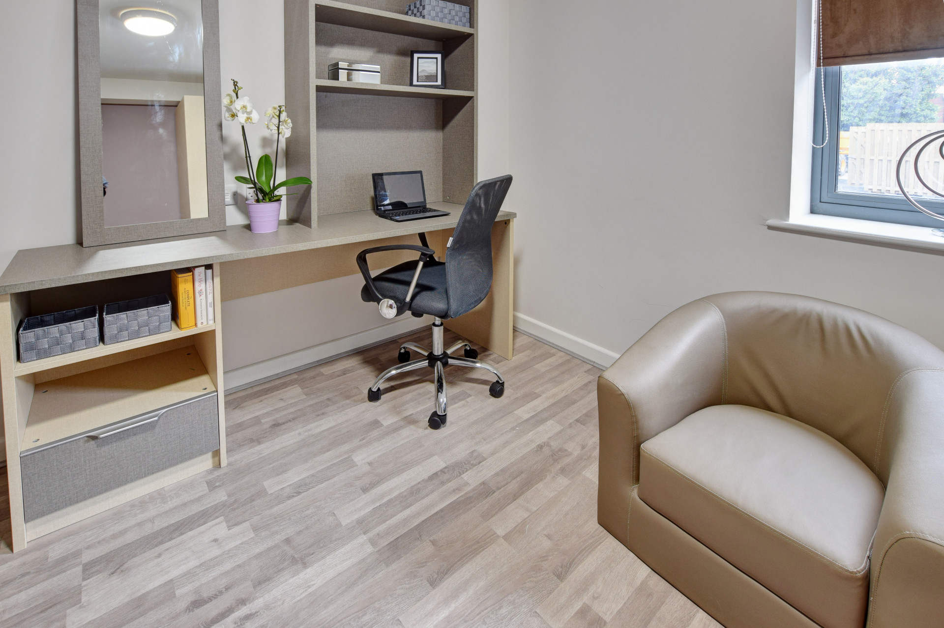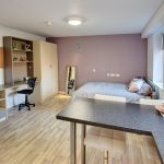 breakfast bar, a spacious and luxury en-suite, separate bedroom and study area, comfy 4ft6 double bed, under bed storage, double wardrobe, study space with notice board, bookshelf, desk, chair, mirror and bedside table. Apartments are up to 37m2.
