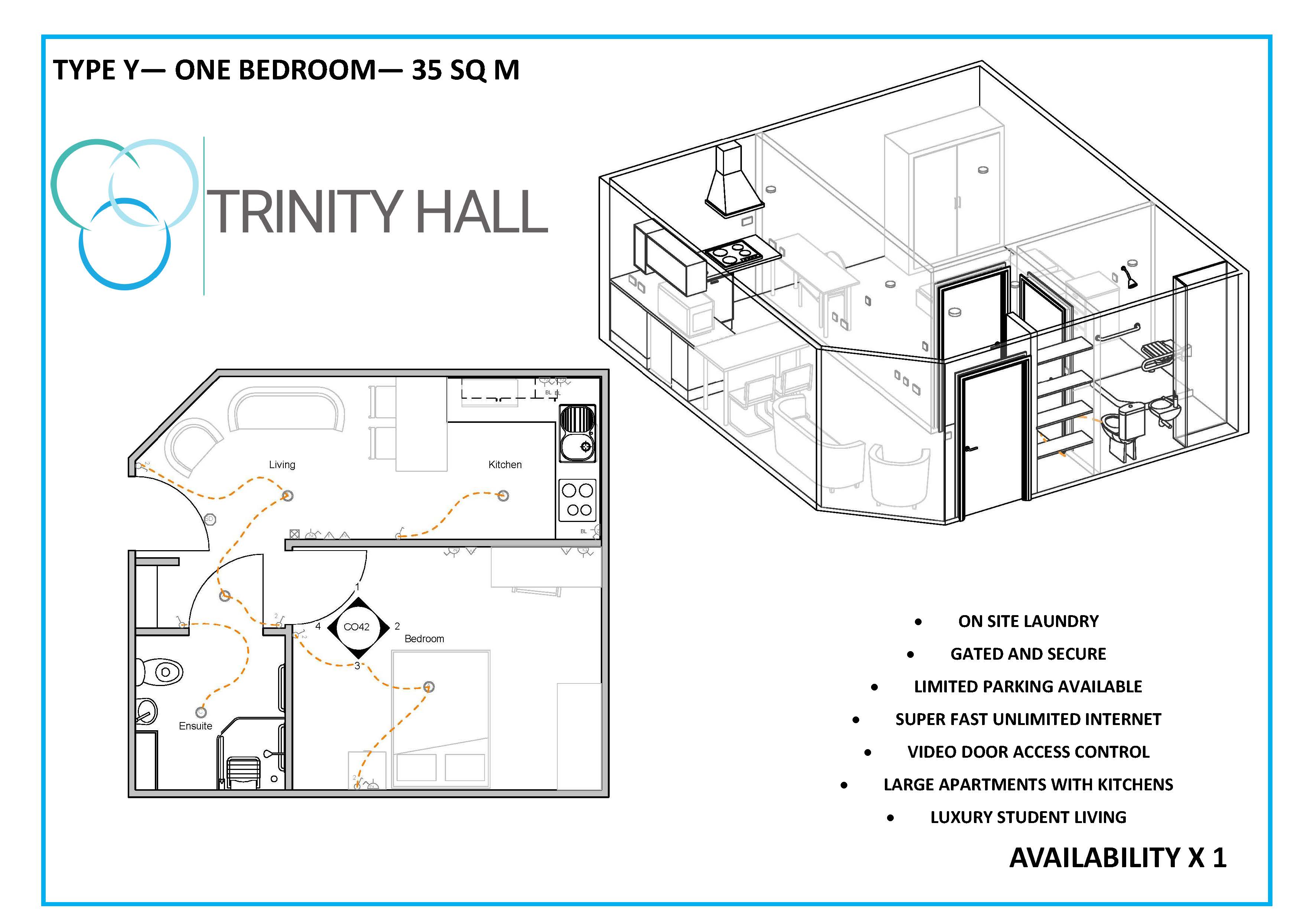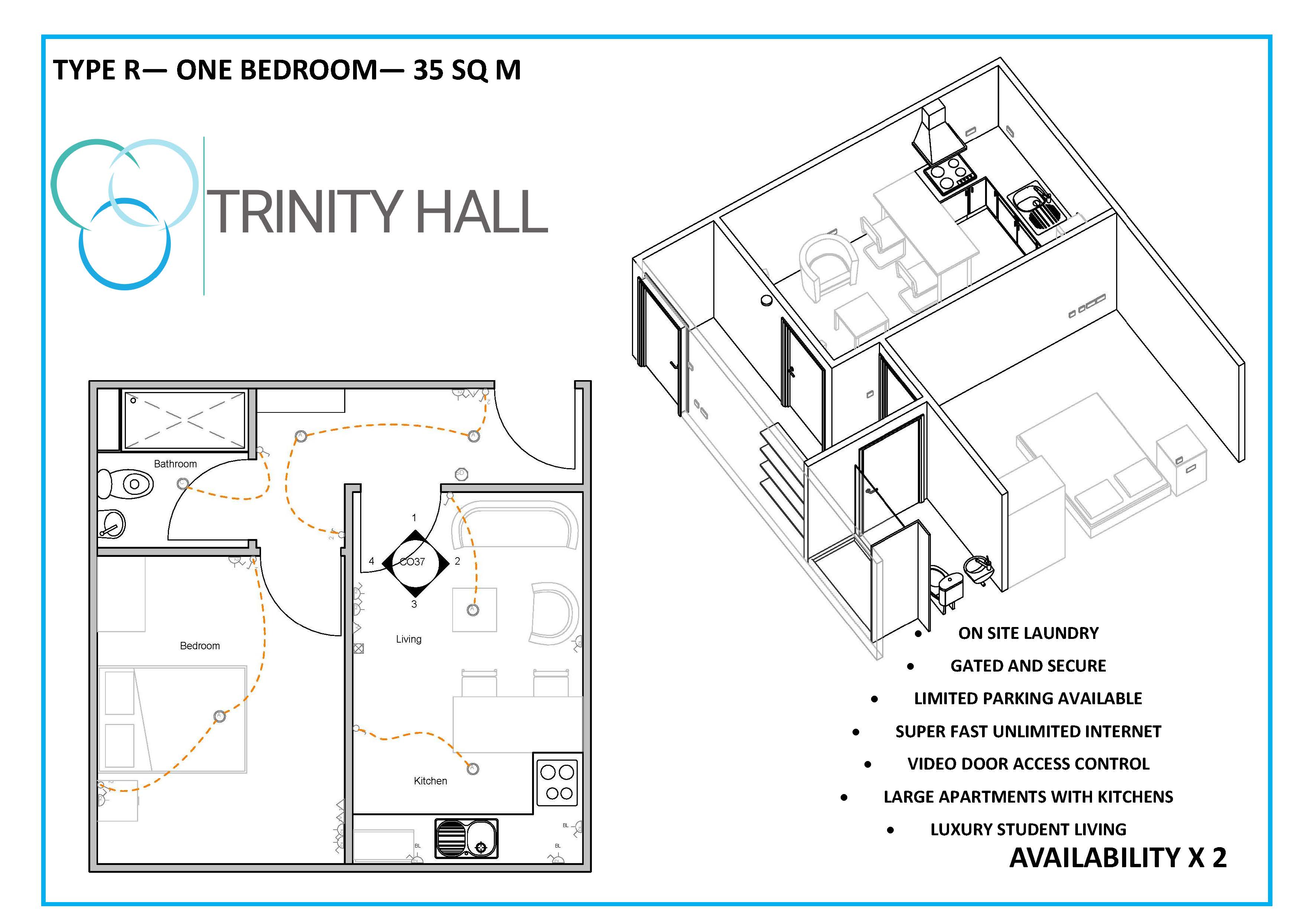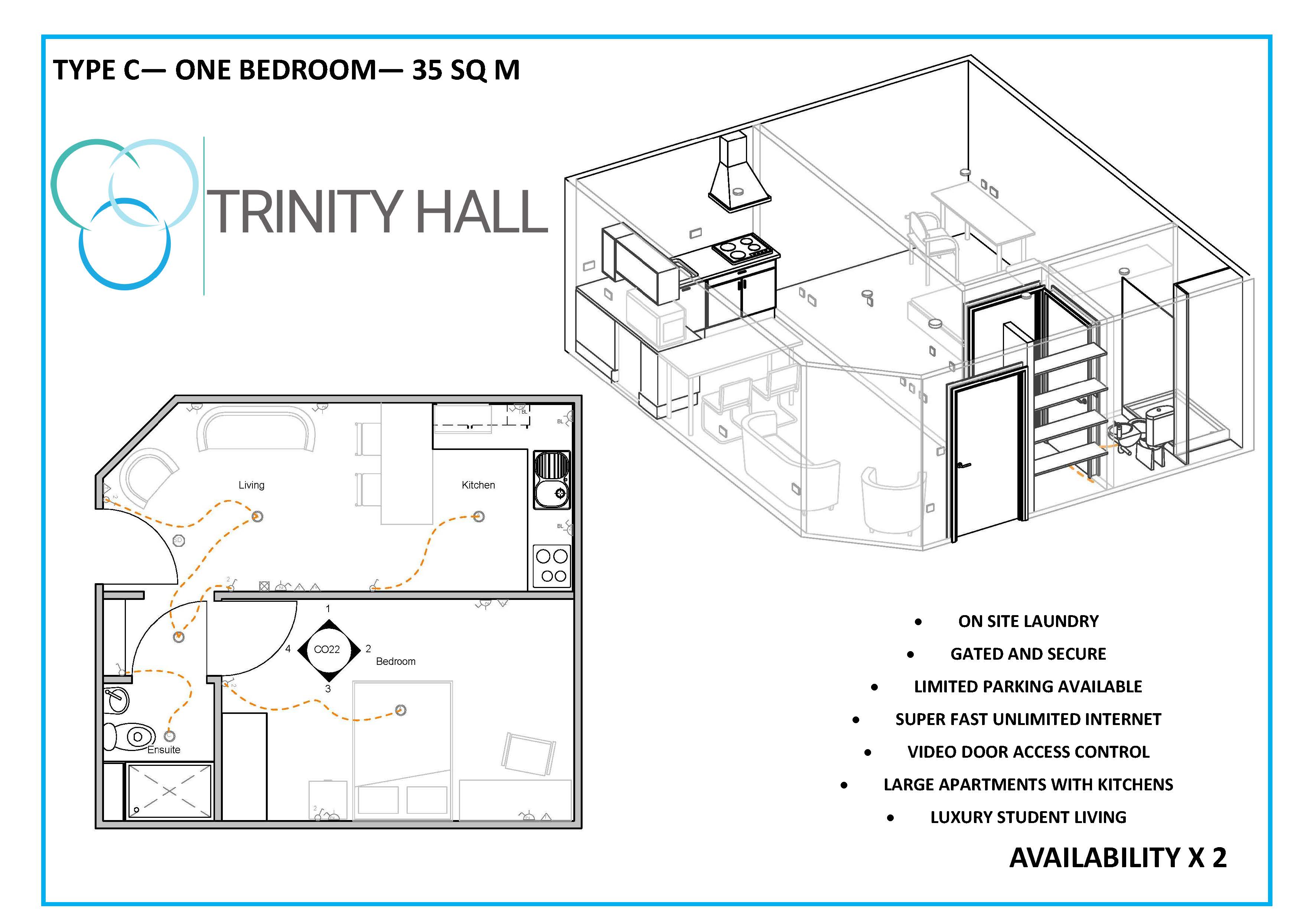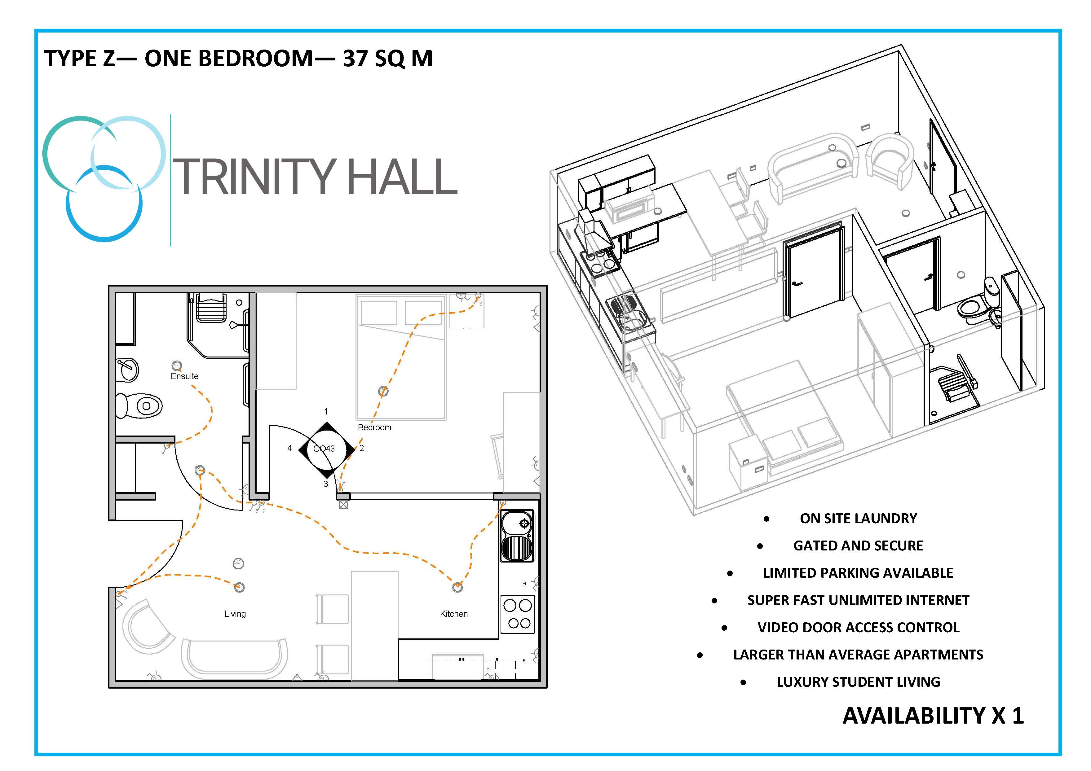 breakfast bar, a spacious and luxury en-suite, separate bedroom and study area, comfy 4ft6 double bed, under bed storage, double wardrobe, study space with notice board, bookshelf, desk, chair, mirror and bedside table. Apartments are up to 37m2.