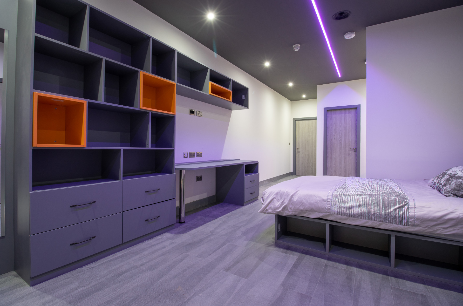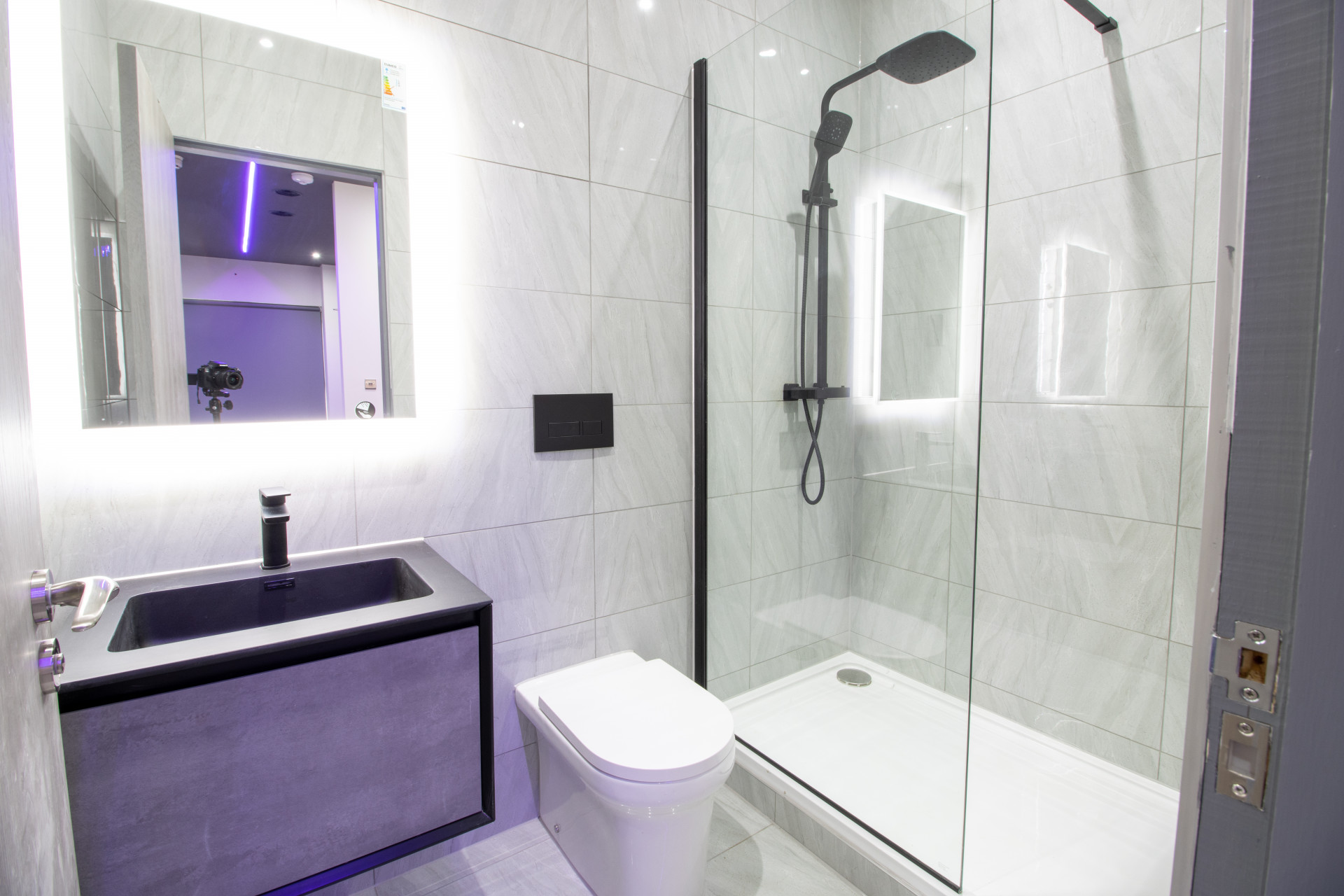 Our brand new for 2021 Studio Luxe D rooms are very modern and finished to a high spec. They include Bluetooth speakers in the main living/bedroom area. LED lighting, located on the higher floors, Shared garden area, Washing/drying machine, full kitchen with oven & microwave, fully tiled bathroom with light up mirror with speakers. We have 2 of these room types range up to 31m2