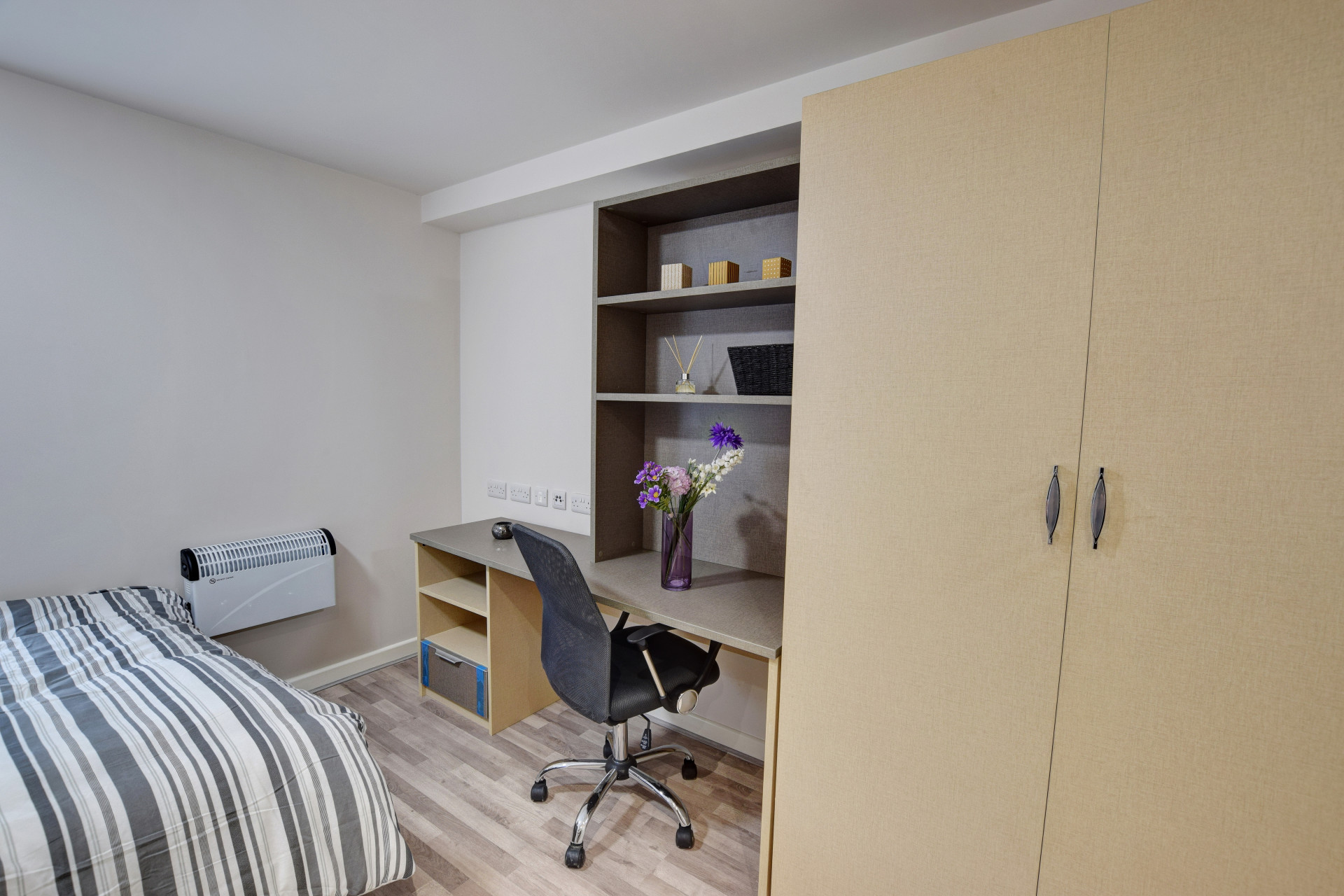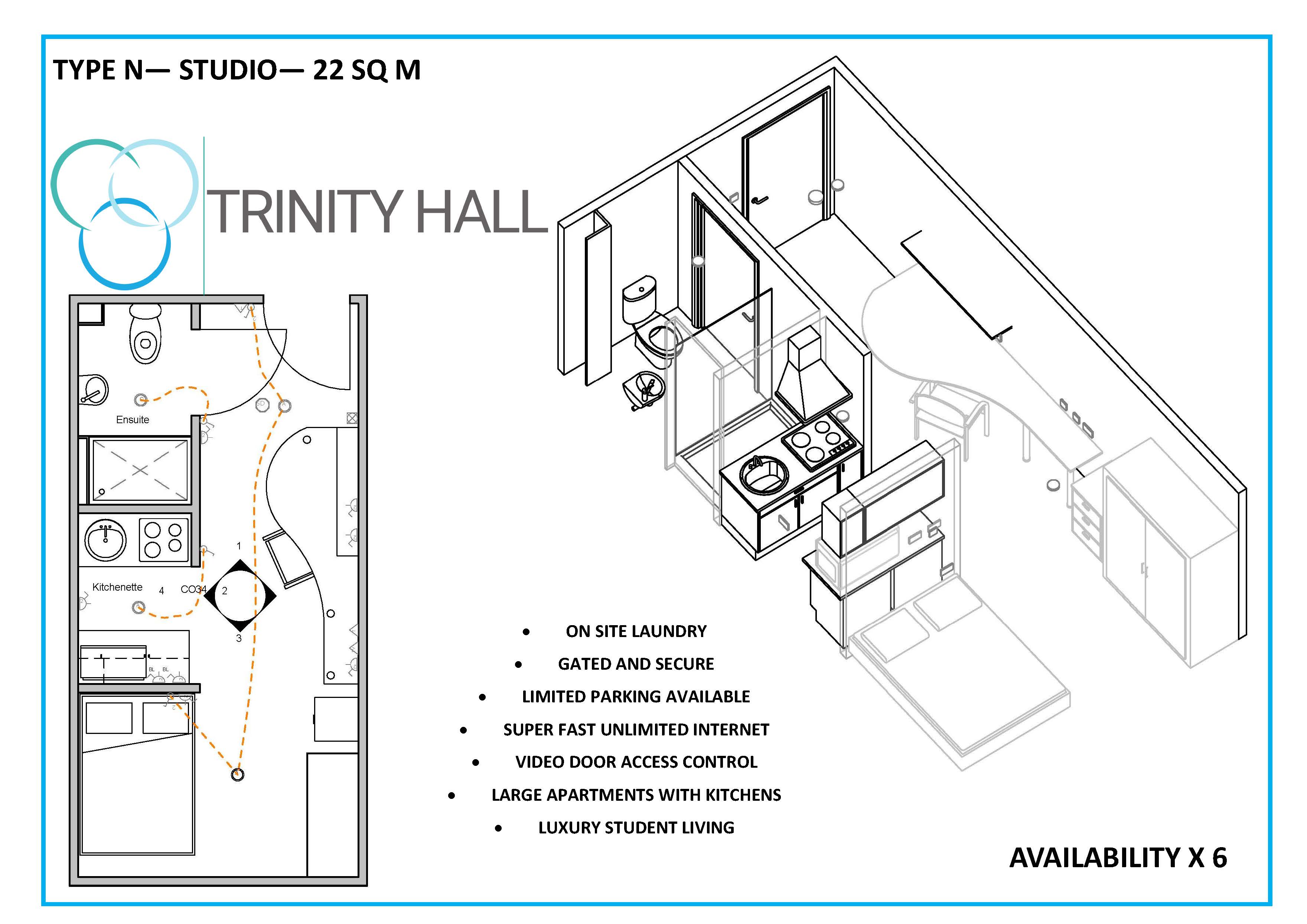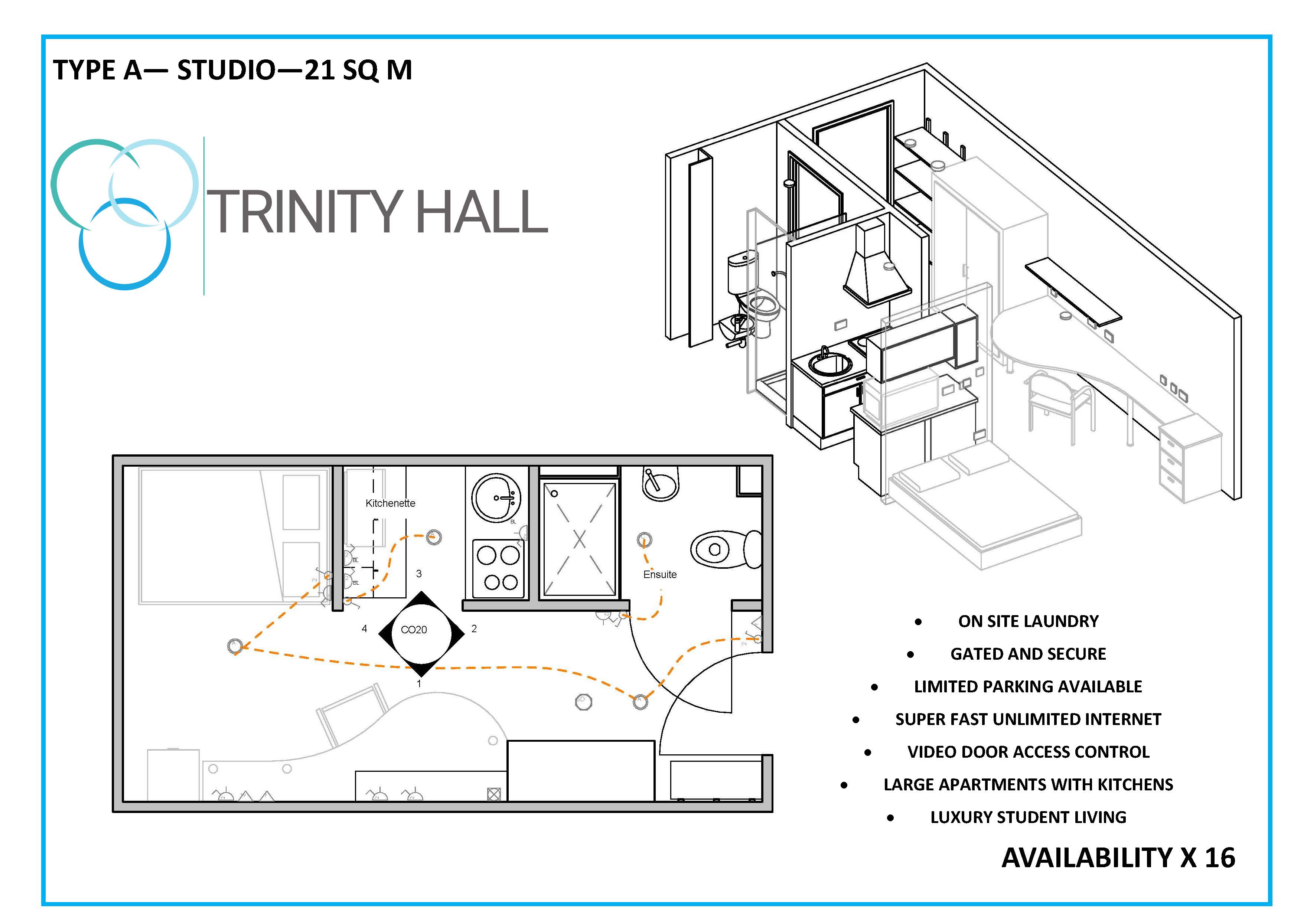 If you are looking for the luxury of your own self contained living space then the studio rooms at Trinity Hall are perfect. Our attractive studio come fully furnished, benefiting from a kitchen area, comfy 4ft6 double bed, under bed storage, double wardrobe, stylish en-suite bathroom and study space with notice board, bookshelf, desk, chair and mirror. Our studios are 21m2.